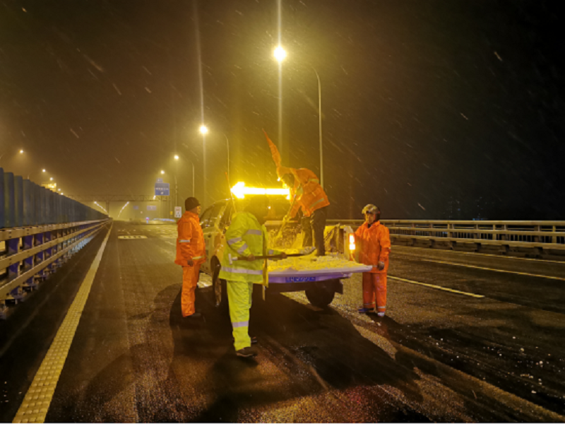 28日夜間,隨著雪勢的增大,監(jiān)控中心密切關(guān)注天氣變化情況,及時發(fā)布路況信息,第一時間通報路面積雪情況,并用擴(kuò)音設(shè)備提醒過往車輛謹(jǐn)慎駕駛,減速慢行。路巡組增加道路巡查頻次,對轄區(qū)路段加強(qiáng)警戒,保障清雪作業(yè)路段道路安全暢通。同時,除雪組及時組織力量對積雪結(jié)冰路段實施融雪除冰處置措施,全力開展除雪保通工作,針對易打滑、陡坡、急彎、伸縮縫等特殊路段進(jìn)行拋灑融雪劑,引導(dǎo)車輛緩慢通行,全力以赴除雪保通。