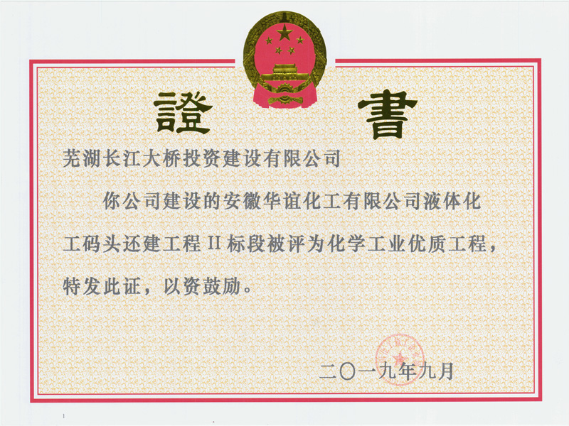 日前,由我公司建設(shè)的安徽華誼化工有限公司液體化工碼頭還建工程Ⅱ標(biāo)段項(xiàng)目,被中國化工企業(yè)施工協(xié)會評為化學(xué)工業(yè)優(yōu)質(zhì)工程。