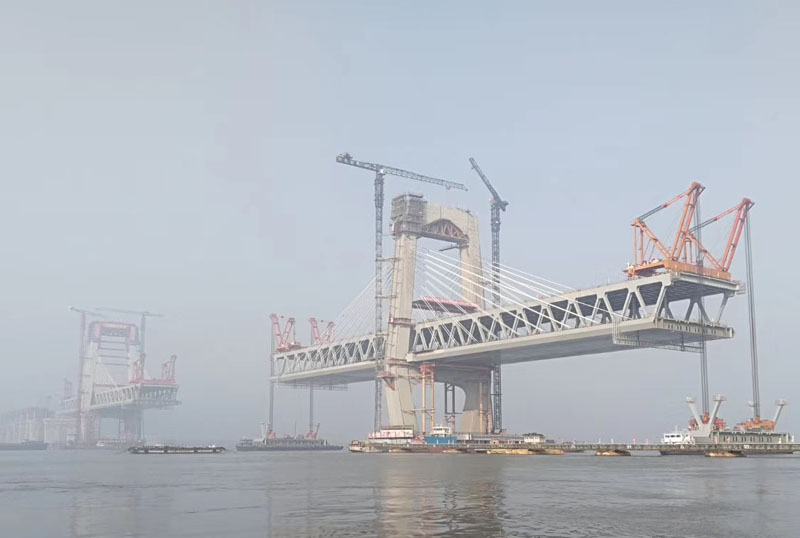商合杭鐵路蕪湖長(zhǎng)江公鐵大橋?yàn)橹骺?88米雙塔雙索面高低塔鋼箱鋼桁組合梁斜拉橋,北岸塔高155米,南岸塔高130.5米,上層為雙向八車道城市道路,下層為客運(yùn)專線和市域軌道線的四線鐵路,是集客運(yùn)專線、市域軌道交通、城市主干道路于一體的公鐵合建橋梁。