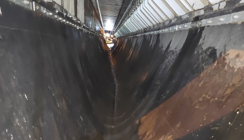 蕪湖長江三橋主橋0#、5#墩處采用最大伸縮量為1200mm的梳齒形伸縮縫,齒間距約50mm,通過橡膠止水帶收集雨水后排至兩側(cè)雨水斗進(jìn)入雨水系統(tǒng)。自三橋通車以來,車輪及雨水裹挾泥沙由梳齒間隙進(jìn)入伸縮縫,止水帶內(nèi)存有不少泥沙和雜物。隨著時(shí)間的推移,止水帶內(nèi)積沙積泥載荷增大,將會(huì)對正下方高鐵運(yùn)行產(chǎn)生威脅。為及時(shí)消除安全隱患,大橋公司路產(chǎn)安全部養(yǎng)護(hù)人員組織外協(xié)單位多次前往現(xiàn)場確定清理方案及安全防護(hù)措施,并在公司領(lǐng)導(dǎo)帶領(lǐng)下及時(shí)對接鐵路蕪湖工務(wù)段,申請高鐵運(yùn)行天窗期開展專門清理工作。