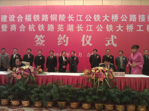 11月12日下午,合作建設(shè)合福鐵路銅陵長江公鐵大橋公路接線工程暨商合杭鐵路蕪湖長江公鐵大橋工程簽約儀式在合肥稻香樓賓館舉行。市委常委、常務(wù)副市長丁祖榮出席簽約儀式。